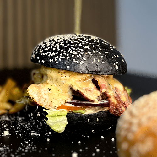 czarna bułka z sezamem, wołowina, ekon, cheddar, pomidor, sałata lodowa, ogórek konserwowy, czerwona cebula, jajko sadzone, sos BBQ z nutą cytryny